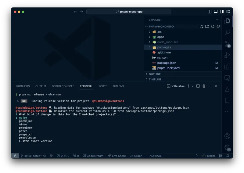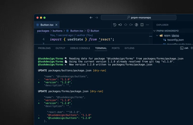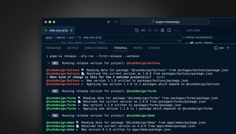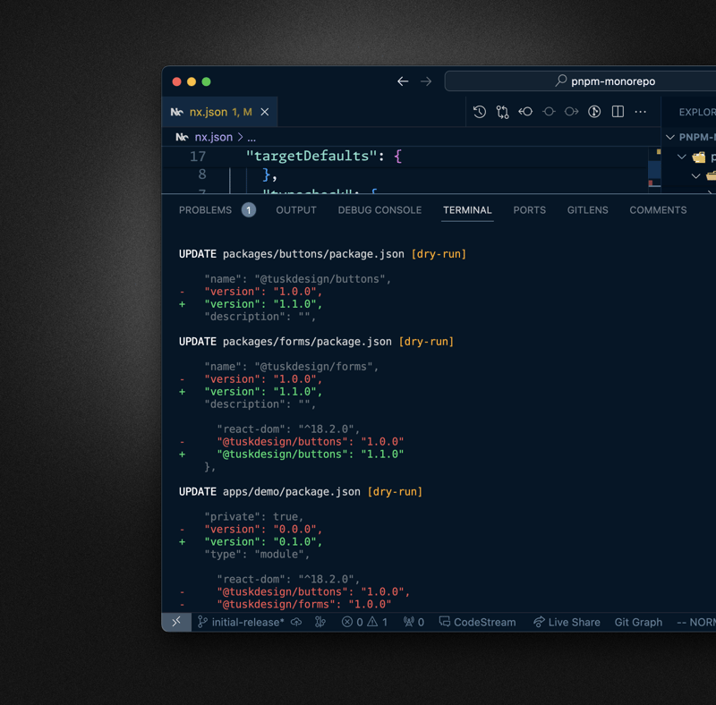 2You can skip the release part when prompted for now. Check how the workspace got updated, incrementing the package.json version property and updating the version on the package dependency definition, i.e. the @tuskdesign/buttons version got updated in the @tuskdesign/forms package.json.